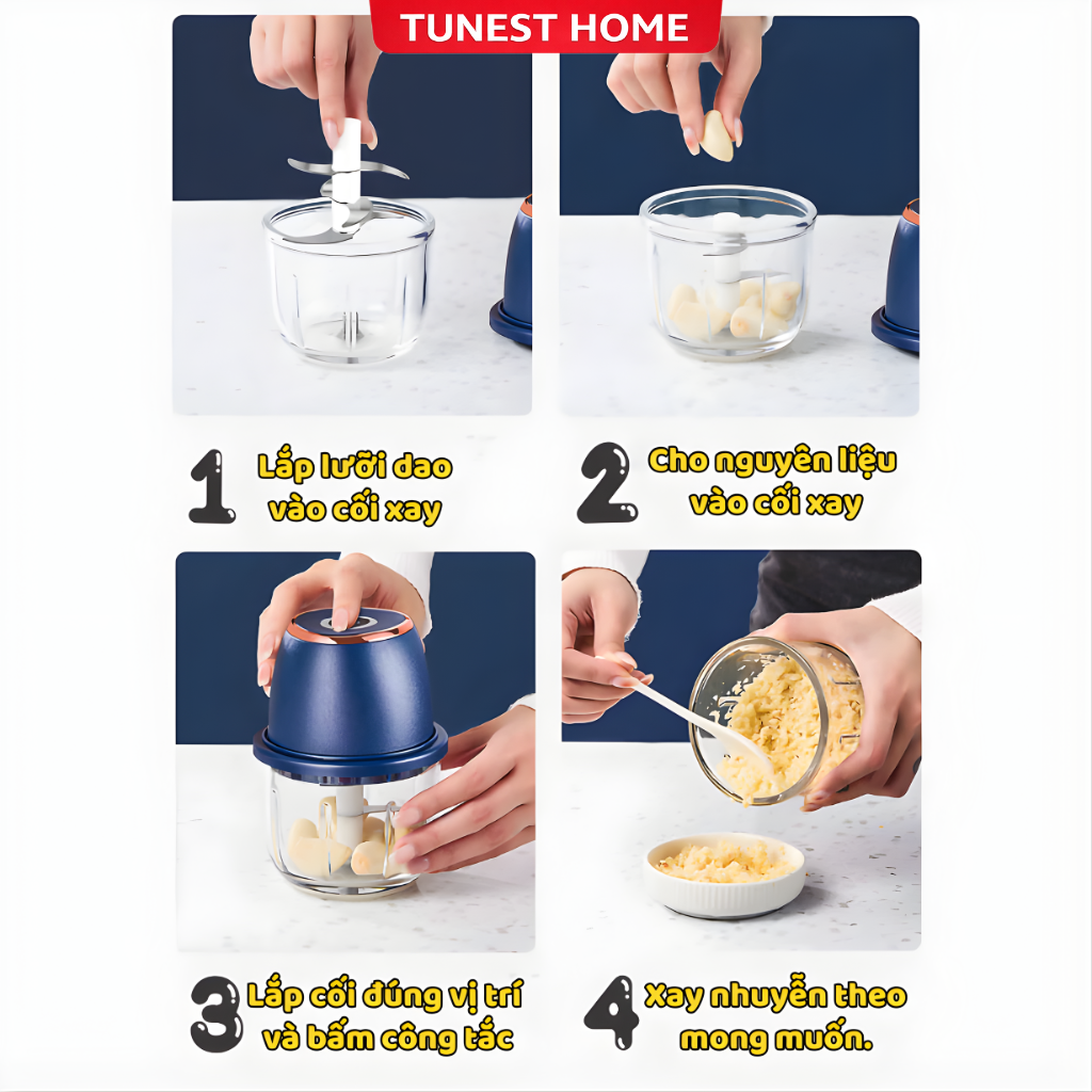 Công dụng: Xay tỏi, ớt, gừng, thịt, rau củ, trái cây, gia vị, đậu phộng…